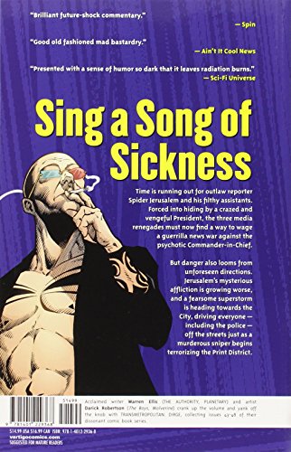 Investigative reporter Spider Jerusalem attacks the injustices of 21st Century surroundings while working for the newspaper The Word in this critically acclaimed graphic novel series written by comics superstar Warren Ellis, co-creator of Planetary" and "The Authority". In this eighth volume of the groundbreaking "Vertigo" series all hell breaks loose as a nameless sniper terrorises the Print District and a raging superstorm clears the streets of The City."Rang parmi les ventes Amazon: #72339 dans LivresMarque: Brand: VertigoPublié le: 2010-09-14Sorti le: 2010-09-14Langue d'origine: AnglaisNombre d'articles: 1Dimensions: 10.20" h x .50" l x 6.70" L, .48 livres Reliure: Broché144 pagesPrésentation de l'éditeurInvestigative reporter Spider Jerusalem attacks the injustices of the 21st Century surroundings while working for the newspaper The Word in this critically-acclaimed graphic novel series written by comics superstar Warren Ellis, the co-creator of PLANETARY and THE AUTHORITY. In this eighth volume collecting issues #43-48 of the groundbreaking VERTIGO title, all hell breaks loose as a nameless sniper terrorizes the Print District and a raging superstorm clears the streets of The City.